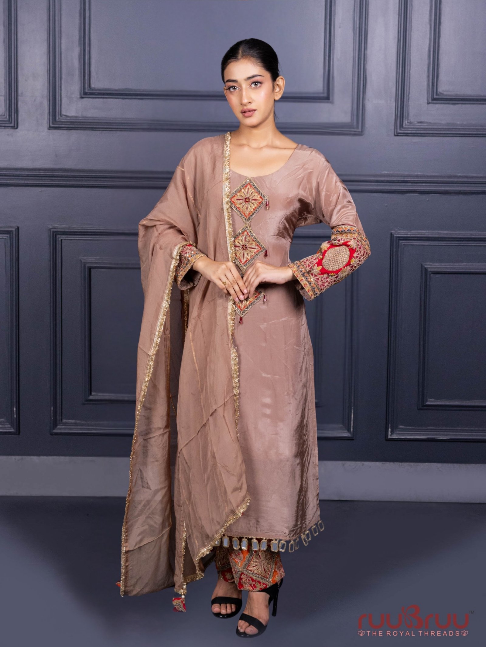 Step into the spotlight with this breathtaking Designer Occasion Wear Ladies Suit, a true masterpiece of luxury and meticulous detail. The entire ensemble is crafted from radiant shimmer silk, creating a dazzling and cohesive silhouette from head to toe. Defying convention, the bottom becomes the star of the show with its lavish heavy embroidery, a bold and innovative design choice that exudes opulence with every step, while both the top and bottom are luxuriously lined with soft mal cotton for unparalleled comfort. The ethereal organza silk dupatta adds a final layer of drama and grace, its sheer brilliance complementing the suit’s shimmer without competing. This avant-garde suit is designed for the fashion-forward woman to make an unforgettable, head-turning entrance at the most exclusive galas and red-carpet events.