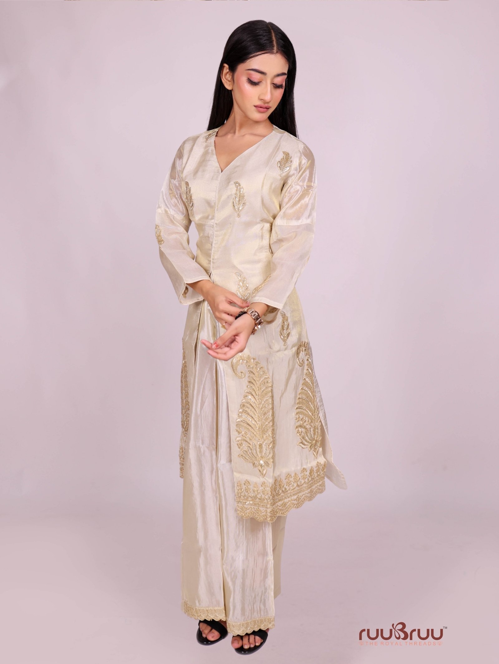 Experience the height of opulent coordination in this exquisite Pure Silk Shimmer Ladies Cord Set, where every element is designed for maximum impact. The set is a masterclass in luxury, crafted from radiant pure silk shimmer fabric that catches the light with every movement. The top is adorned with lavish premium zardozi and intricate dori embroidery, a testament to artisanal skill, all comfortably lined with soft mal cotton. The bottom elevates the ensemble further, featuring beautifully detailed embroidery at the waist and hem that creates a perfectly harmonious and continuous flow of design. This impeccably matched set offers a seamless silhouette of unparalleled grandeur, making it the definitive choice for making a majestic statement at the most prestigious weddings and celebrations.