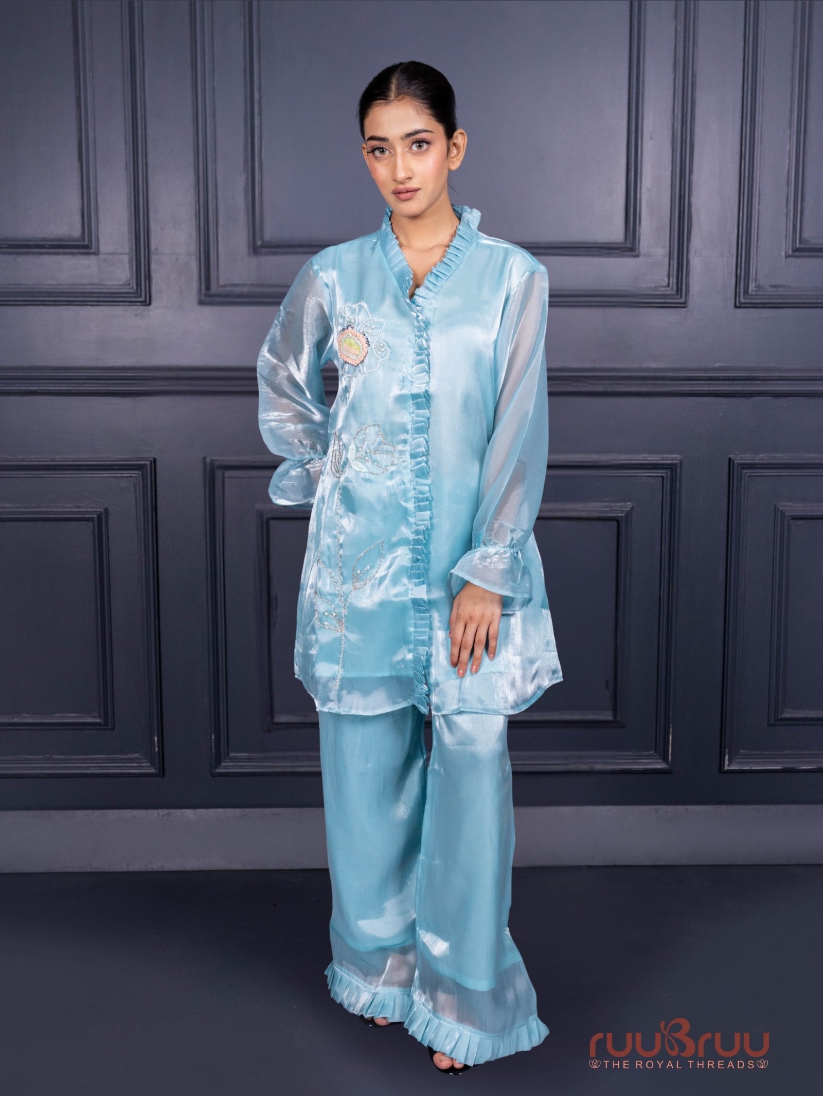 Experience the perfect fusion of modern design and luxurious comfort with our ‘Premium Viscose Silk Cord Set,’ featuring a contemporary designer culottes-style pant that redefines elegance. Both the top and bottom are crafted from sumptuous Viscose Silk, known for its graceful drape and delicate sheen, and are thoughtfully lined with breathable Mal Cotton to ensure a comfortable, structured fit that flatters your form. The distinctive corded texture adds sophisticated depth and visual interest to the ensemble, creating a striking and fashion-forward look ideal for weddings, festive celebrations, or any special occasion where you desire to make a memorable statement with unparalleled style and refinement.