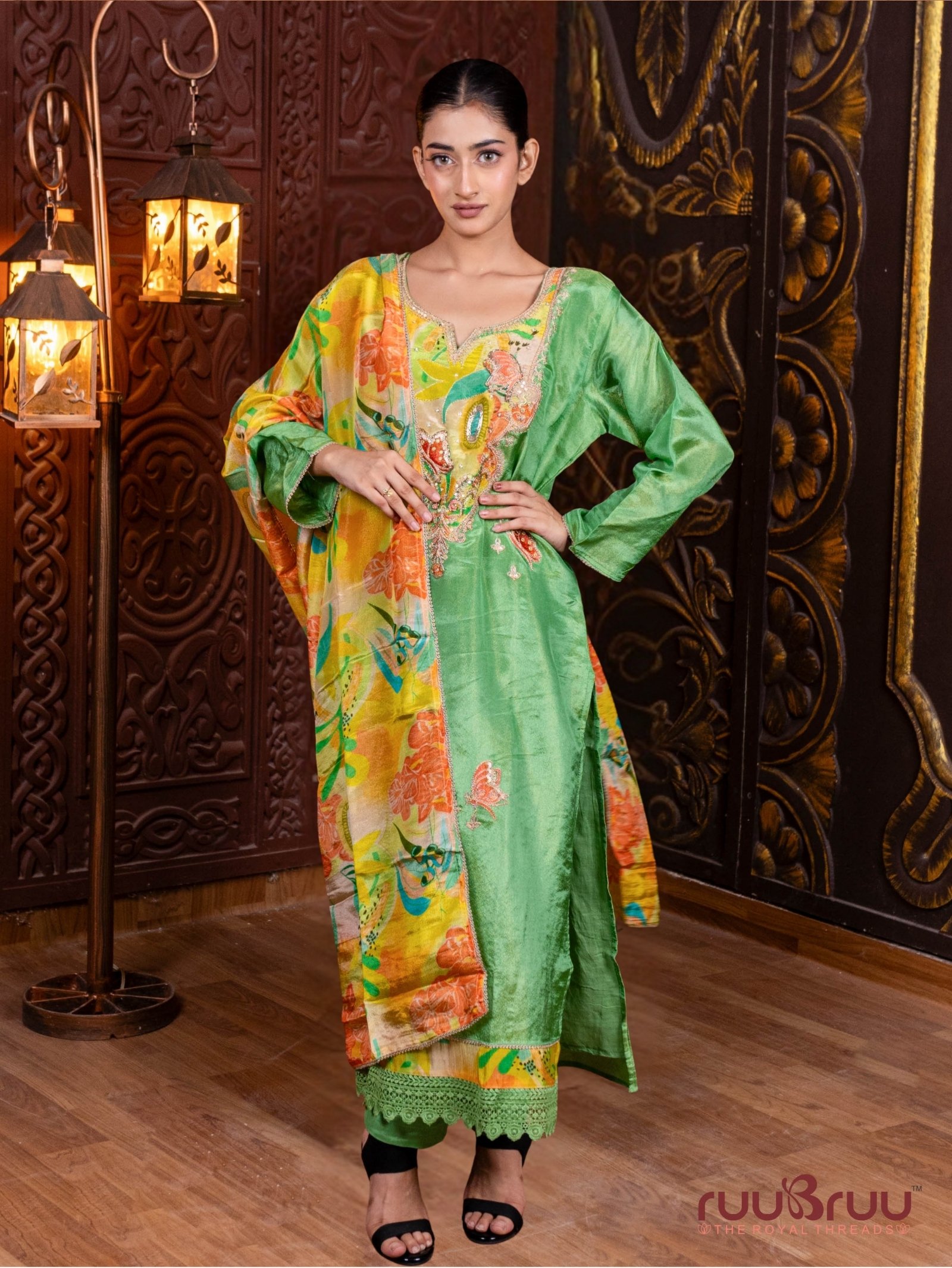 Radiate opulence in this exquisite ladies’ suit, meticulously crafted from lustrous Pure Silk Shimmer for a captivating presence. The top is a masterpiece of artistry, featuring intricate patch work and delicate embroidery on its luxurious fabric, all thoughtfully lined with soft mal cotton for supreme comfort. Paired with a fluid, pure viscose silk bottom for effortless grace, the ensemble is elevated by a stunning digital print dupatta in matching pure silk shimmer, creating a harmonious blend of traditional craftsmanship and modern design that is perfect for making a grand entrance at weddings and celebratory soirées.