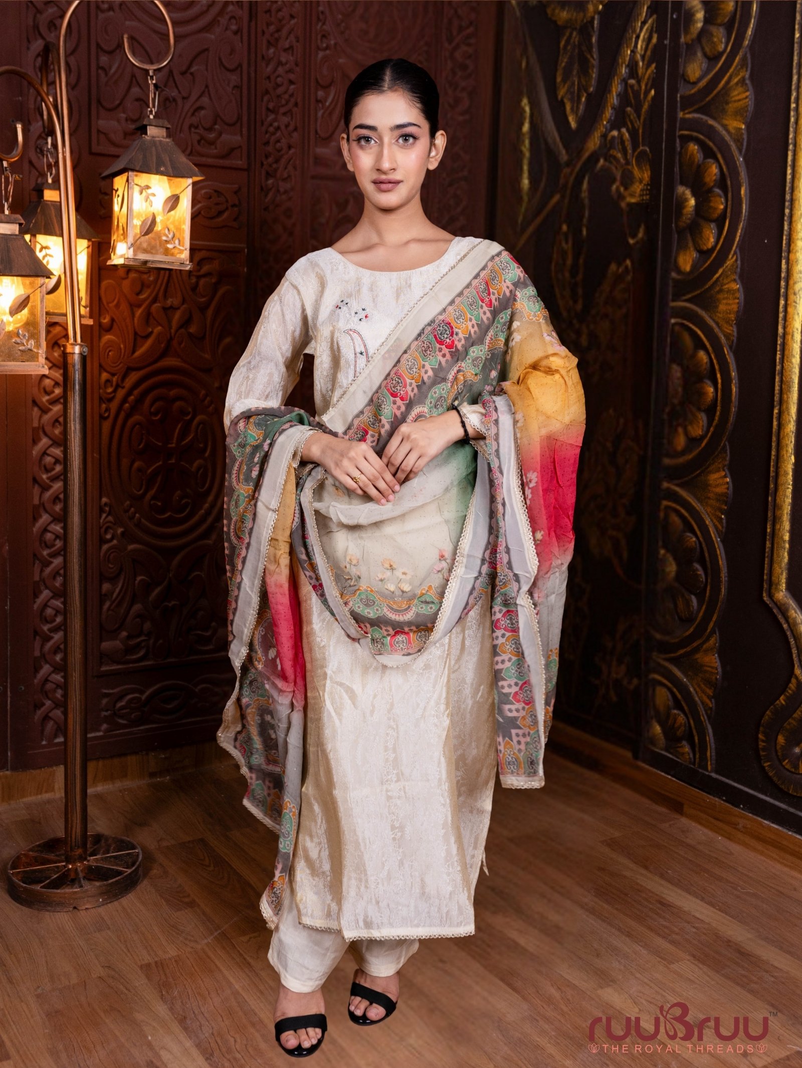 Indulge in a captivating play of textures and light with this exquisite Pure Silk Shimmer ladies’ suit, designed for the modern connoisseur of luxury. The top is a masterpiece of opulence, featuring premium embroidery that adds dimension and brilliance to the lustrous fabric, all thoughtfully lined with soft mal cotton for sublime comfort. It is elegantly paired with a fluid pure viscose silk bottom that offers a graceful, complementary drape. The ensemble reaches its dramatic climax with a statement dupatta crafted from ethereal pure organza silk, featuring a contemporary digital print that creates a stunning visual contrast against the traditional embroidery. This harmonious blend of shimmer, structure, and artistry makes this suit an unforgettable choice for making a grand entrance at weddings and prestigious soirées.