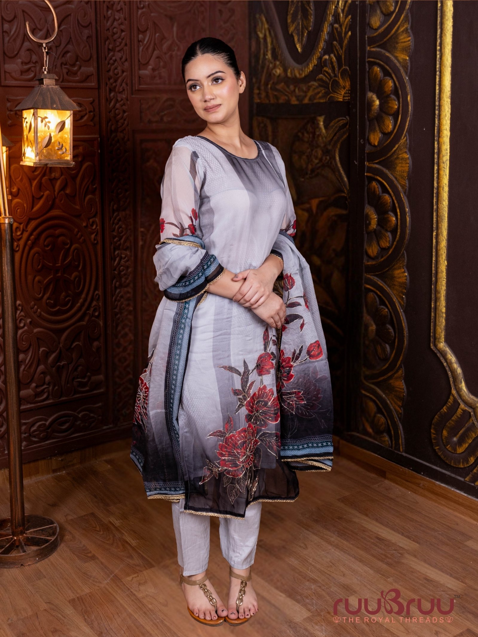 Experience the captivating blend of structure and delicacy in this exquisite Pure Viscose Organza ladies’ suit, a true homage to modern artistry. The top features a striking digital print adorned with luxurious zari embroidery, creating a beautiful play of patterns and metallic sheen on the crisp, translucent fabric, all thoughtfully lined with soft mal cotton for comfort. It is paired with a fluid pure viscose silk bottom that offers a graceful contrast in drape and movement. The ensemble is completed by a dramatic digital print dupatta in matching pure viscose organza, which adds volume and a contemporary edge, making this suit an unforgettable and fashion-forward choice for grand celebrations and weddings.