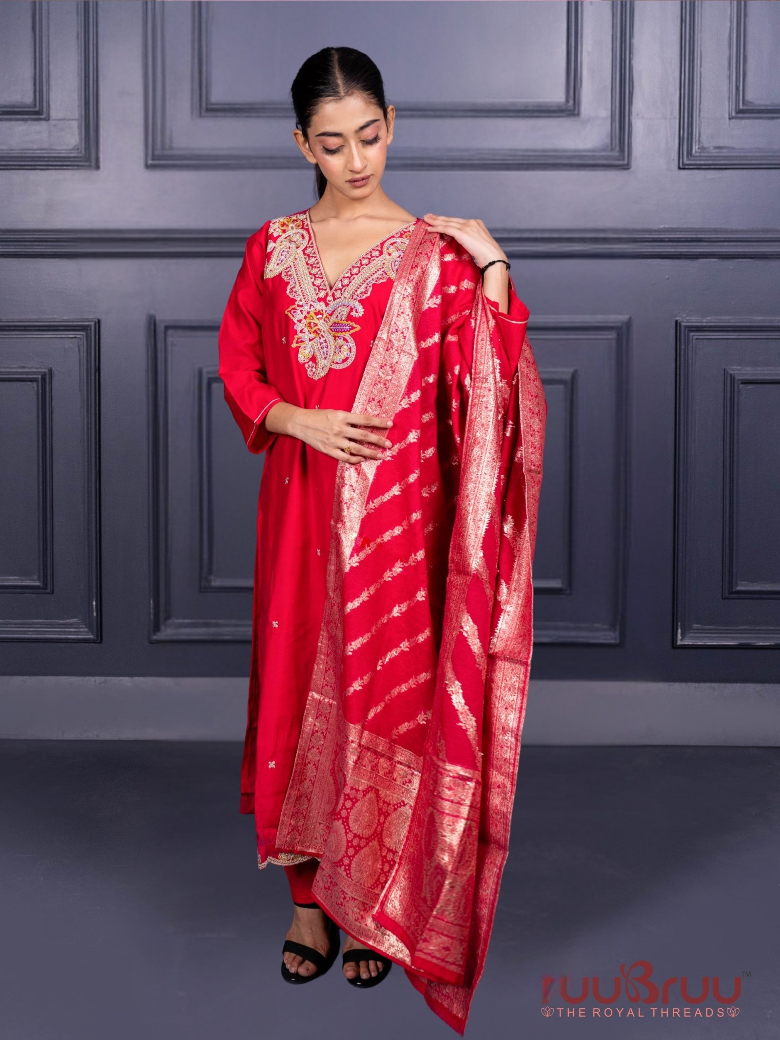 Embrace the perfect synthesis of modern fluidity and traditional opulence with our Pure Viscose Silk Ladies Suit with Banarasi Dupatta. This stunning ensemble is designed for the contemporary woman with a taste for heritage grandeur. The kurti is meticulously crafted from pure Viscose Silk, celebrated for its exceptionally soft drape, elegant sheen, and comfortable wear, all while being luxuriously lined with breathable Mal Cotton for added comfort. It is paired with flawlessly tailored Viscose Silk trousers, ensuring a cohesive and flowing silhouette that moves with grace. The crowning glory of this outfit is the resplendent Banarasi dupatta, a masterpiece of intricate weaving that introduces a regal touch of texture and color. A harmonious blend of effortless style and majestic artistry, this suit is an impeccable choice for making a sophisticated statement at weddings, festive celebrations, and special gatherings.