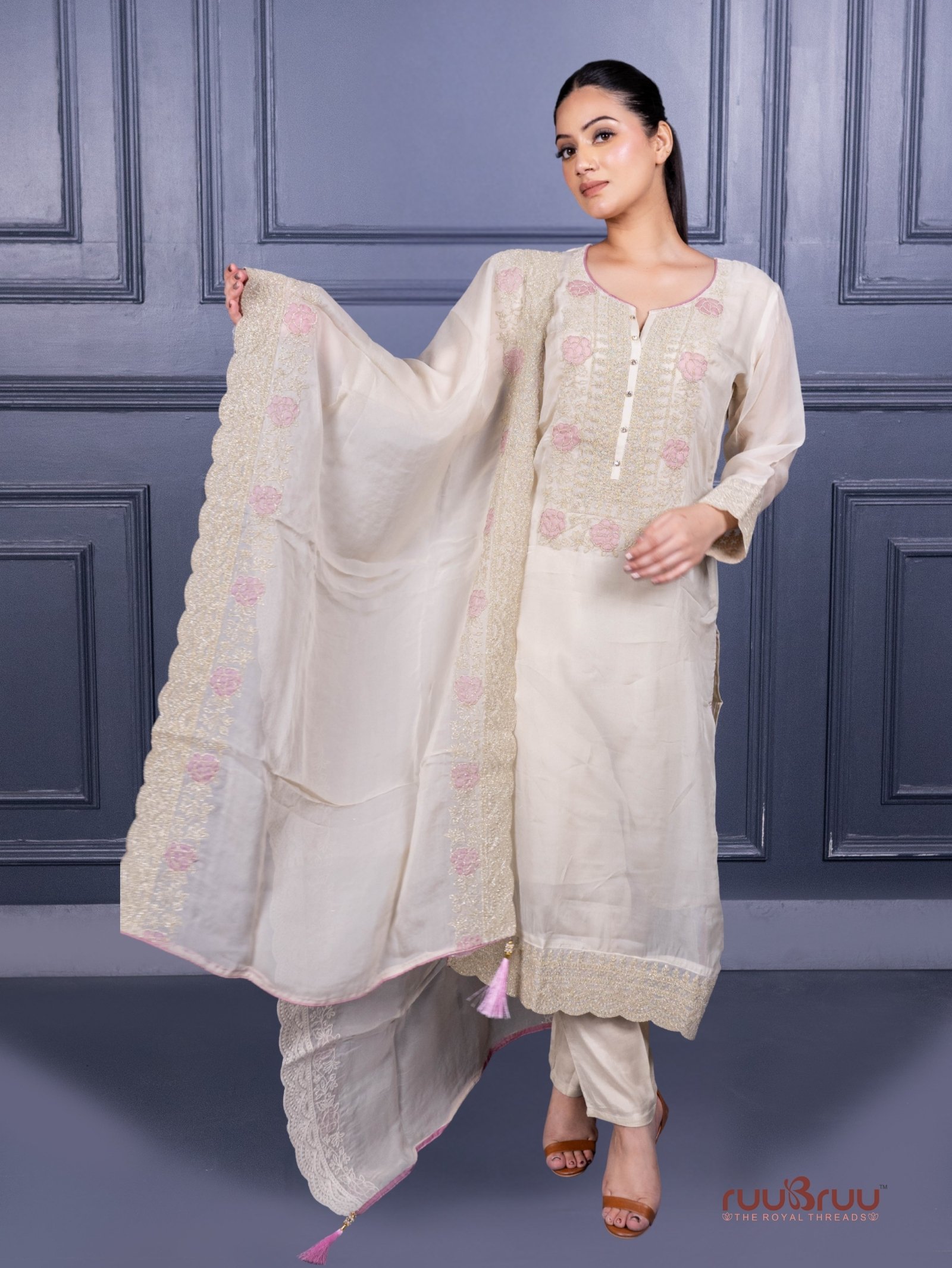 Material TypeTop: Pure Organza Silk with Mal Cotton Lining | Bottom: Viscose Silk | Dupatta: Organza Silk with Heavy Embroidery and Tassels.